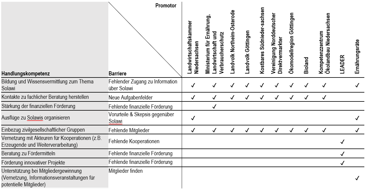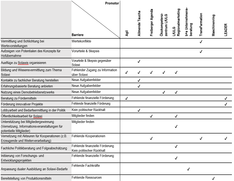 Akteure bzw. Institutionen, die außerhalb der landwirtschaftlichen Produktion agieren, können landwirtschaftliche Betriebe bei der Umstellung auf Solidarische Landwirtschaft (Solawi) unterstützen. Diese Akteure werden als Promotoren bezeichnet und können entsprechend ihrer Kompetenzen als Fach-, Netzwerk- oder Machtpromotor kategorisiert werden. Promotoren können die Verbreitung des Solawi-Modells in ihrer jeweiligen Region vorantreiben, indem sie helfen, Umstellungsbarrieren abzubauen.