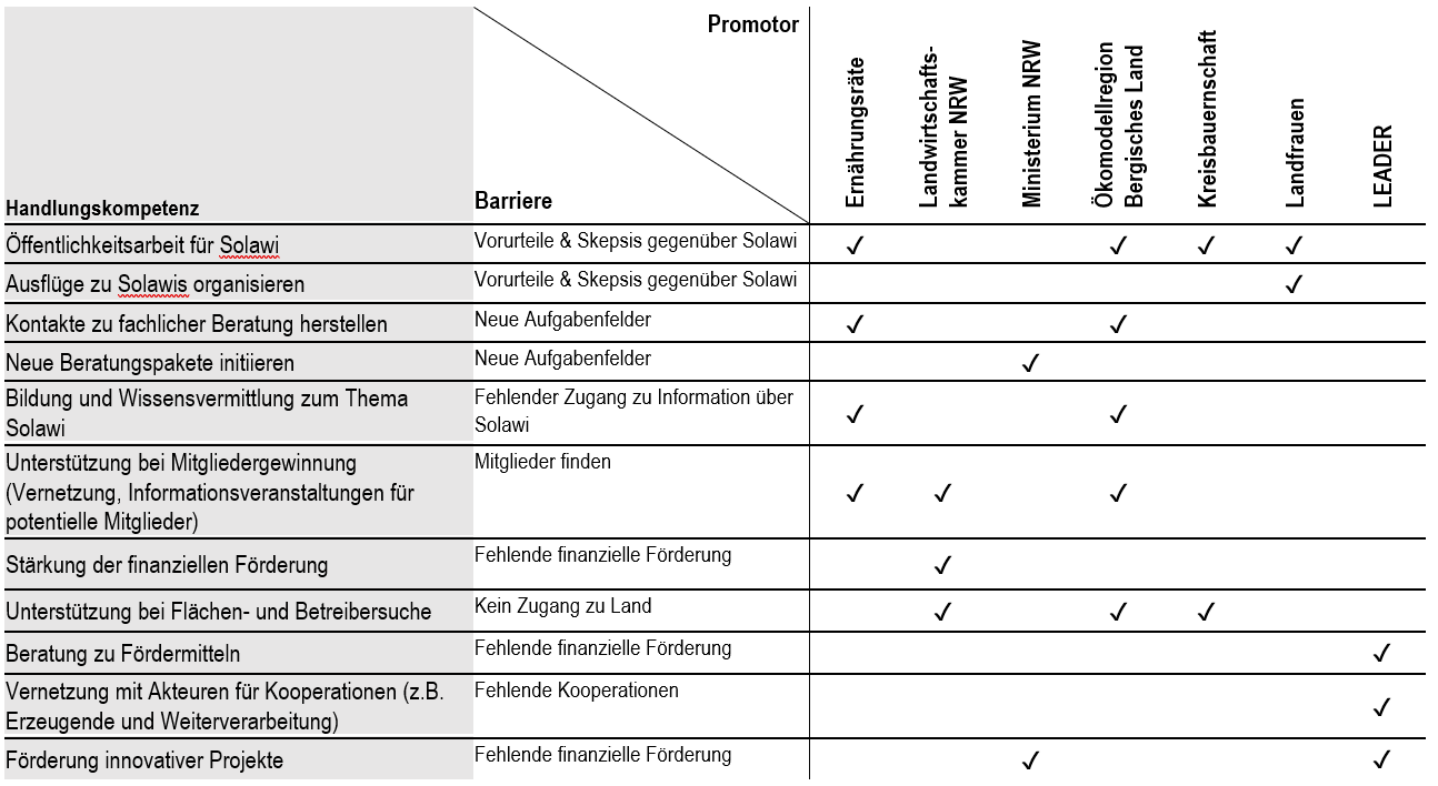 Im Rahmen des Projektes wurden in einem ersten Schritt relevante Akteure in den vier Projektregionen in NRW (Bergisches Land), Niedersachsen (Südniedersachsen), Sachsen (Meißen/ Mittelsachsen) und Thüringen (Weimarer Land, Gotha, Ilm-Kreis) identifiziert, die aufgrund ihrer Kompetenzen als Promotoren für die Diffusion von Solawi wirken können, identifiziert. Anschließend wurden in mehreren Workshops gemeinsam mit den Promotoren der jeweiligen Region konkrete Handlungsoptionen erarbeitet, um die lokale Diffusion von Solawi durch Umstellung bestehender Betriebe zu fördern. Diese durch die Promotoren entwickelten Handlungsoptionen oder auch -kompetenzen prägen und gestalten die regionalen Innovationslandschaften für die Innovation Solawi.